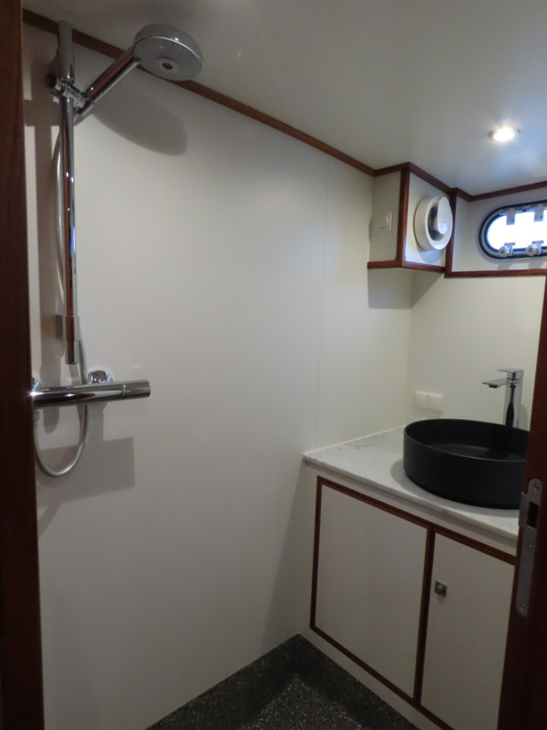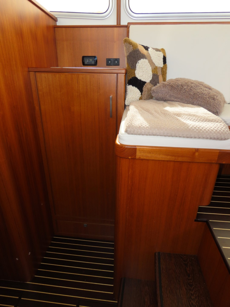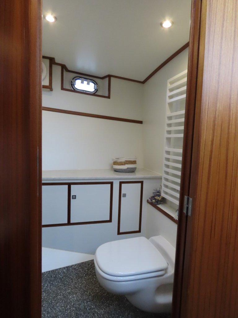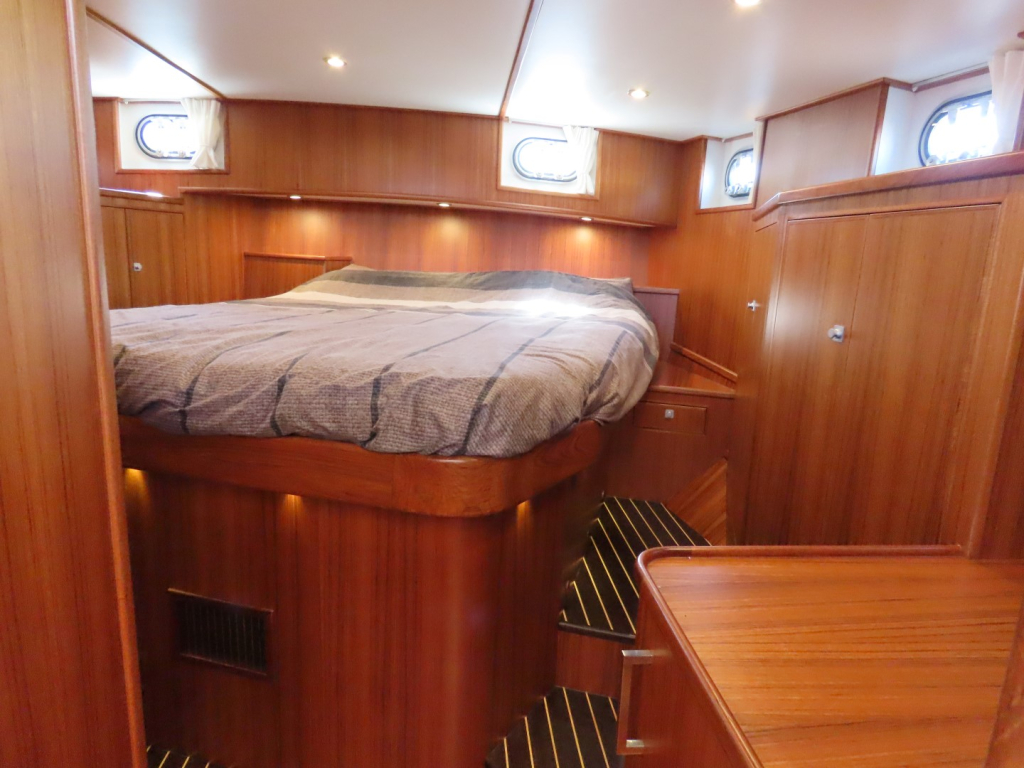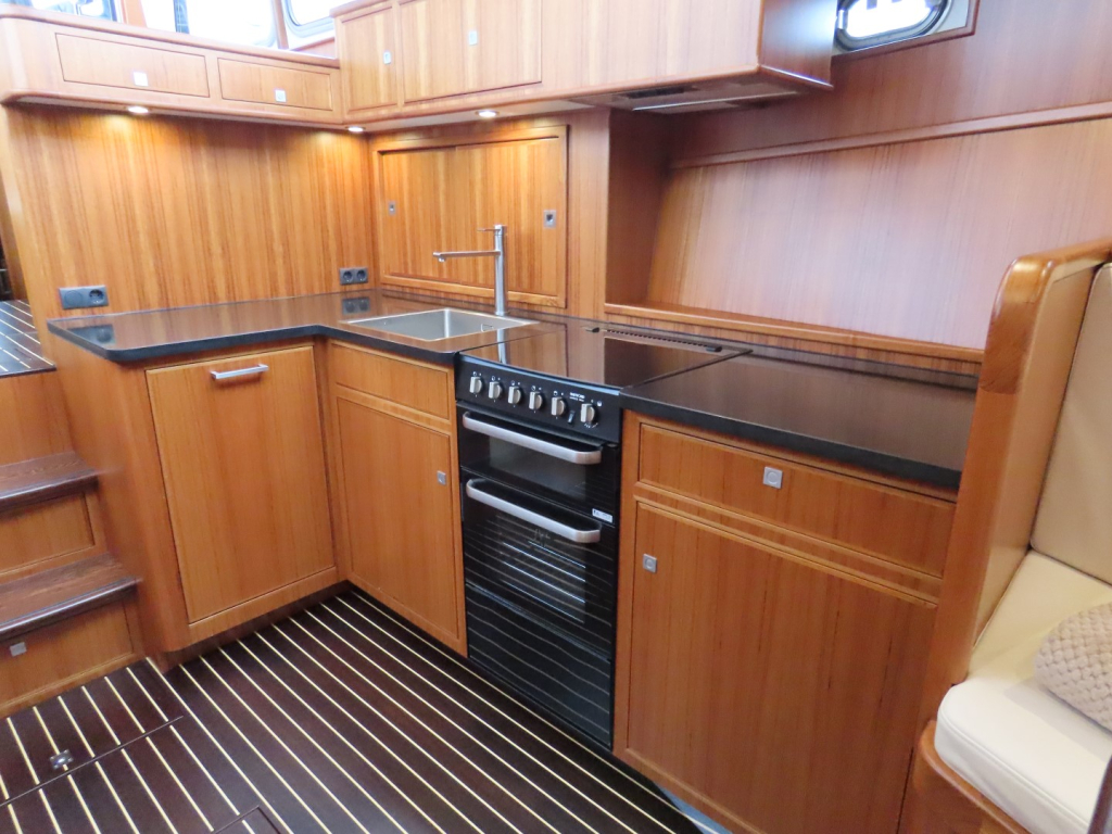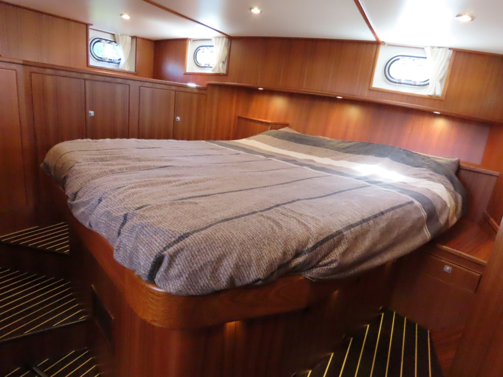 Bijzonder fraai teak interieur met witte kalfslederen stoffering. Clima airco/ verwarming met drie afzonderlijke units. Natuurstenen werkblad in kombuis. Vaatwasser, afzuigkap, vriezer, royale koelkast en oven. Douche-en toiletruimte afgewerkt met marmer. LED verlichting dimbaar, ook indirect. Elektrische ventilatie in natte cel en toilet. Mede door het dubbele glas en de zelfvoorzienende elektrische installatie is het een schip om langere reizen mee te maken en op te verblijven.