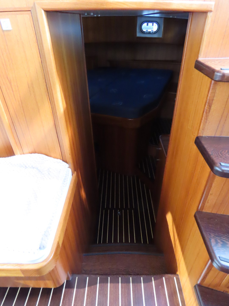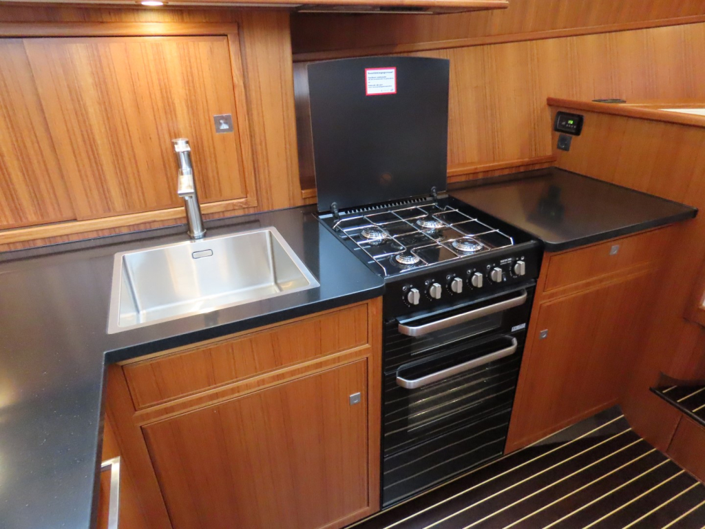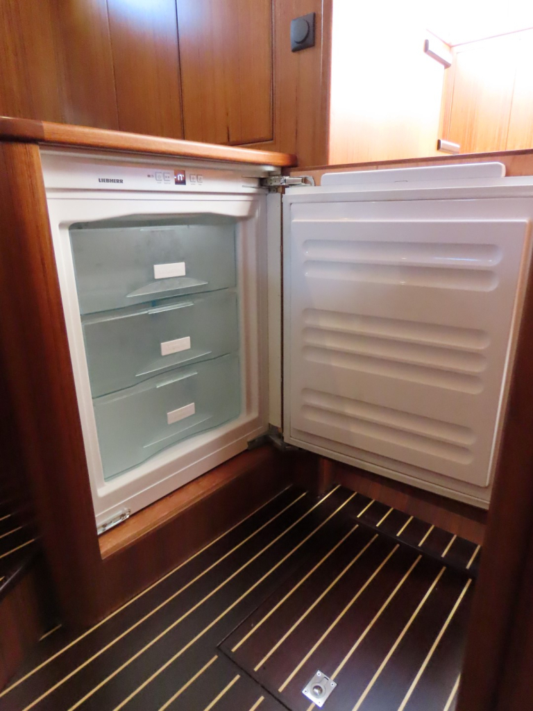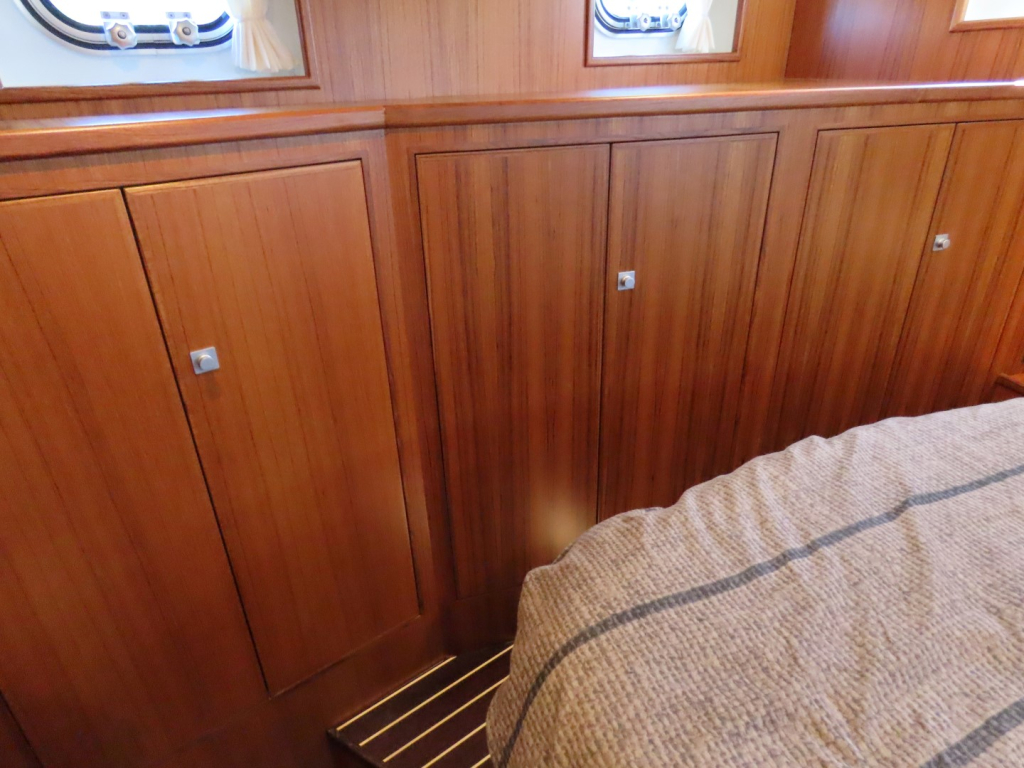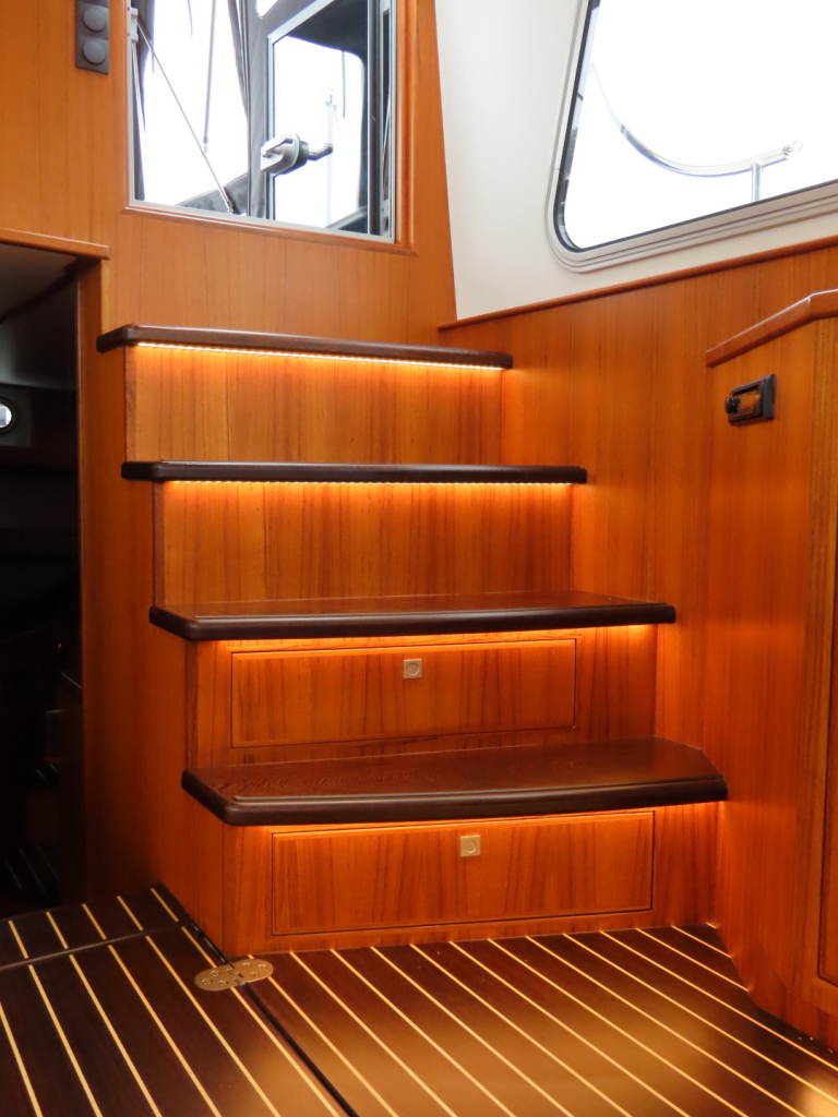 Bijzonder fraai teak interieur met witte kalfslederen stoffering. Clima airco/ verwarming met drie afzonderlijke units. Natuurstenen werkblad in kombuis. Vaatwasser, afzuigkap, vriezer, royale koelkast en oven. Douche-en toiletruimte afgewerkt met marmer. LED verlichting dimbaar, ook indirect. Elektrische ventilatie in natte cel en toilet. Mede door het dubbele glas en de zelfvoorzienende elektrische installatie is het een schip om langere reizen mee te maken en op te verblijven.