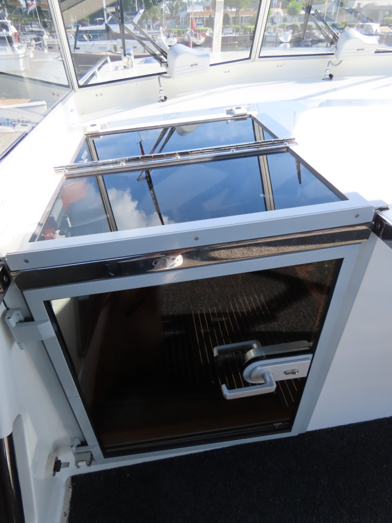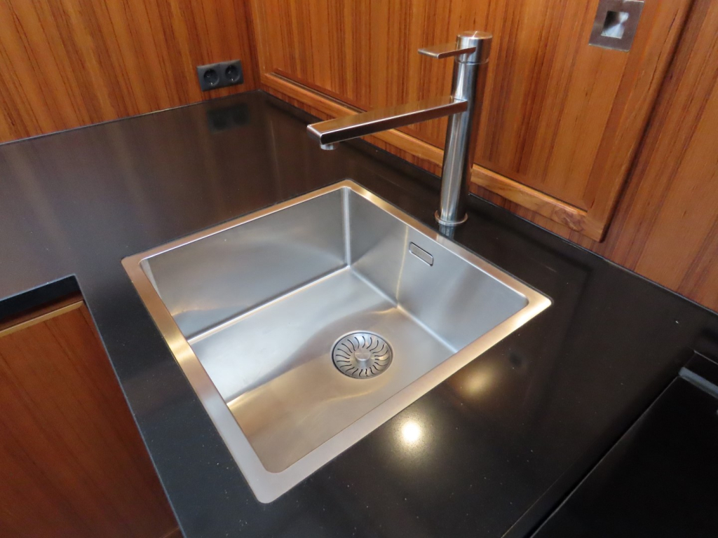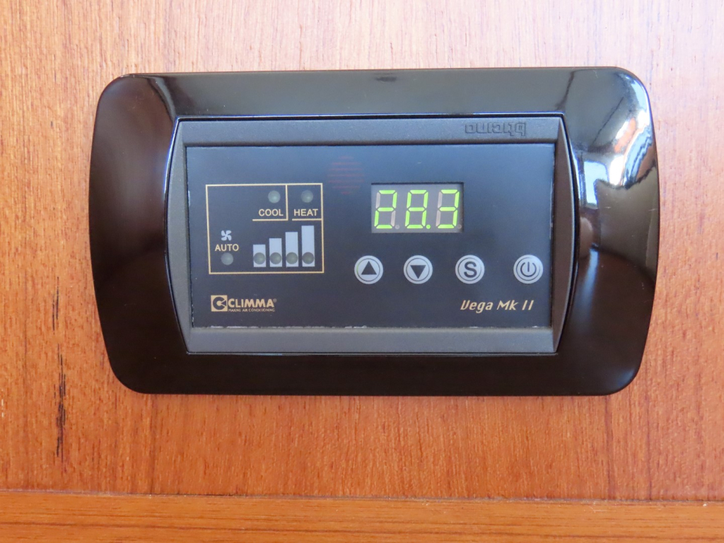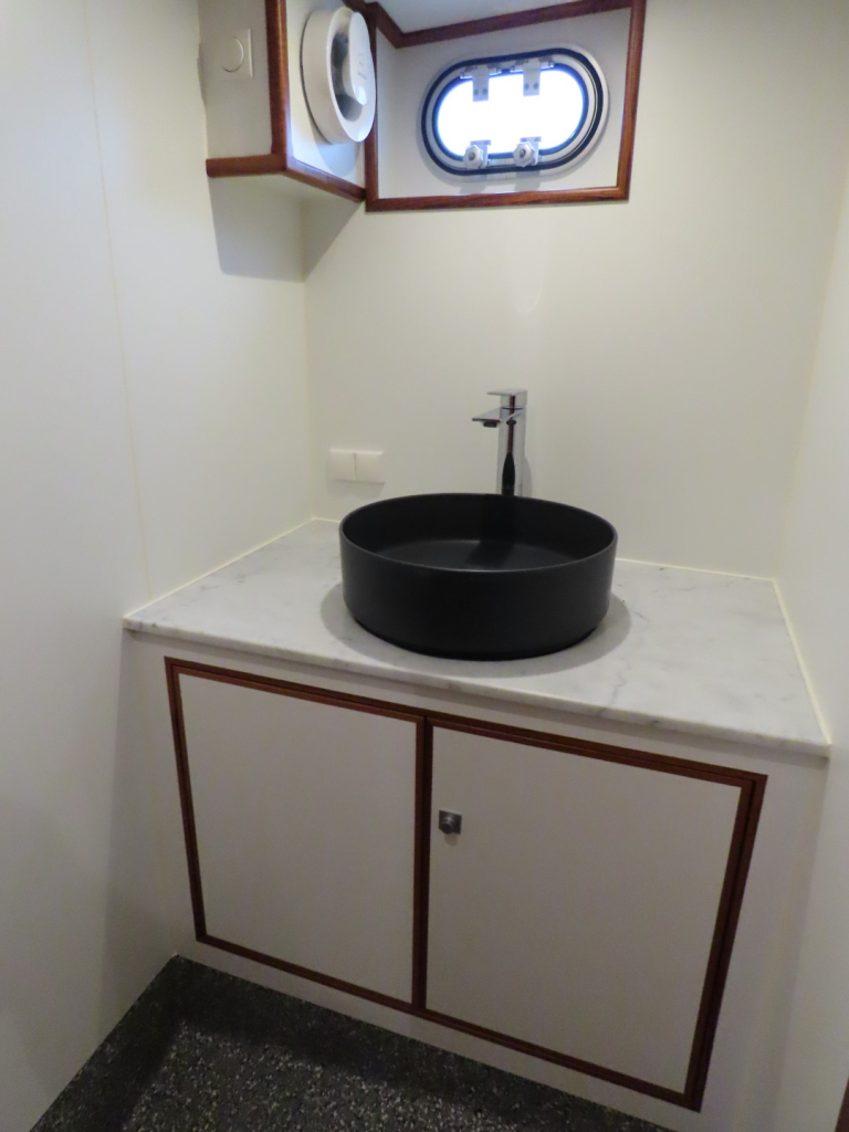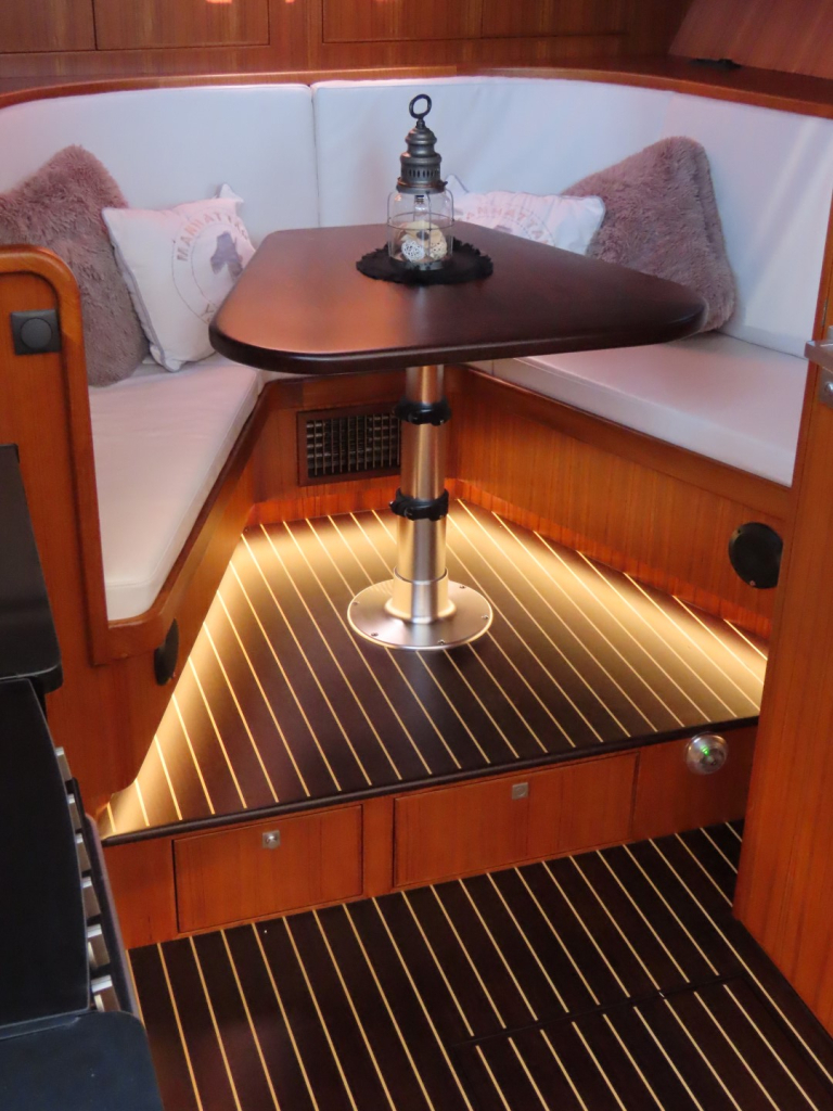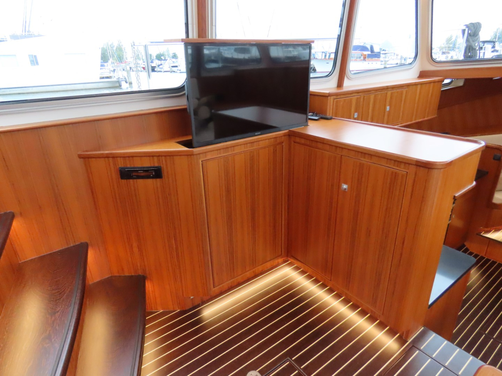 Bijzonder fraai teak interieur met witte kalfslederen stoffering. Clima airco/ verwarming met drie afzonderlijke units. Natuurstenen werkblad in kombuis. Vaatwasser, afzuigkap, vriezer, royale koelkast en oven. Douche-en toiletruimte afgewerkt met marmer. LED verlichting dimbaar, ook indirect. Elektrische ventilatie in natte cel en toilet. Mede door het dubbele glas en de zelfvoorzienende elektrische installatie is het een schip om langere reizen mee te maken en op te verblijven.