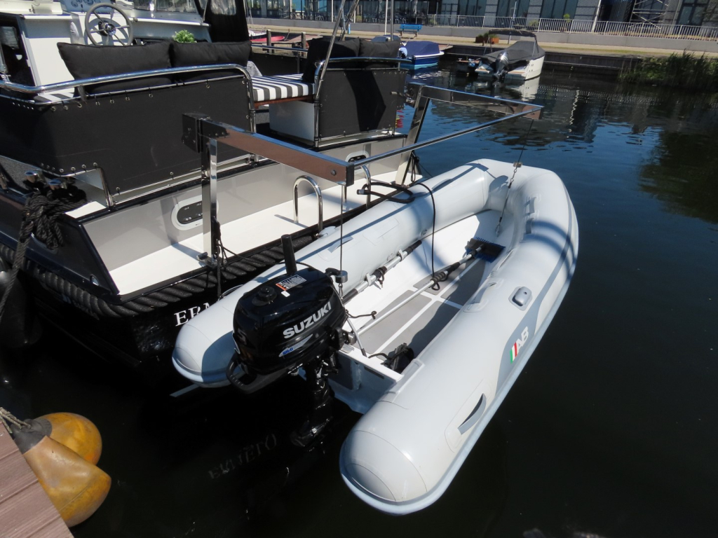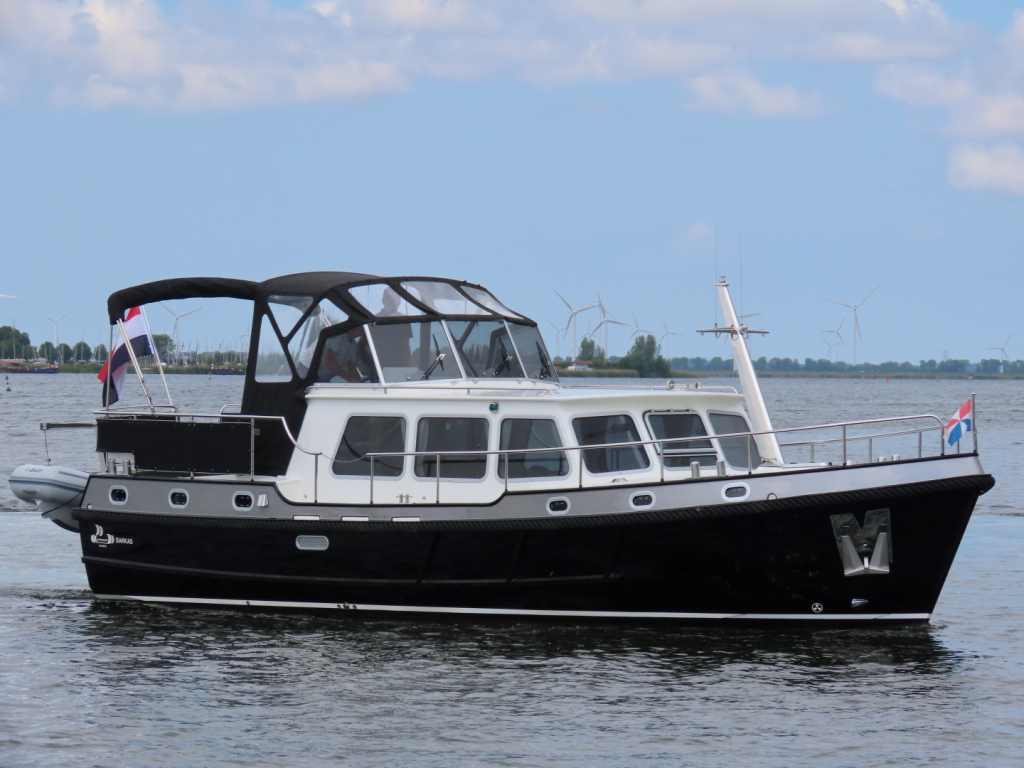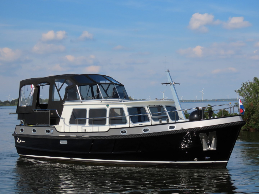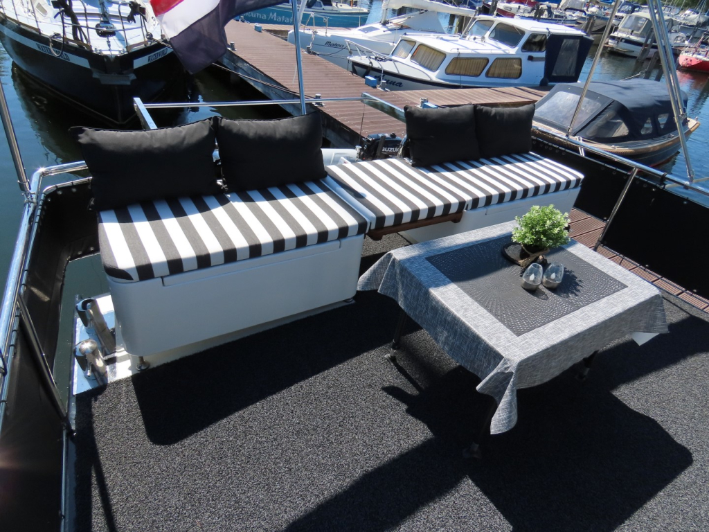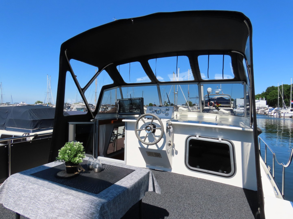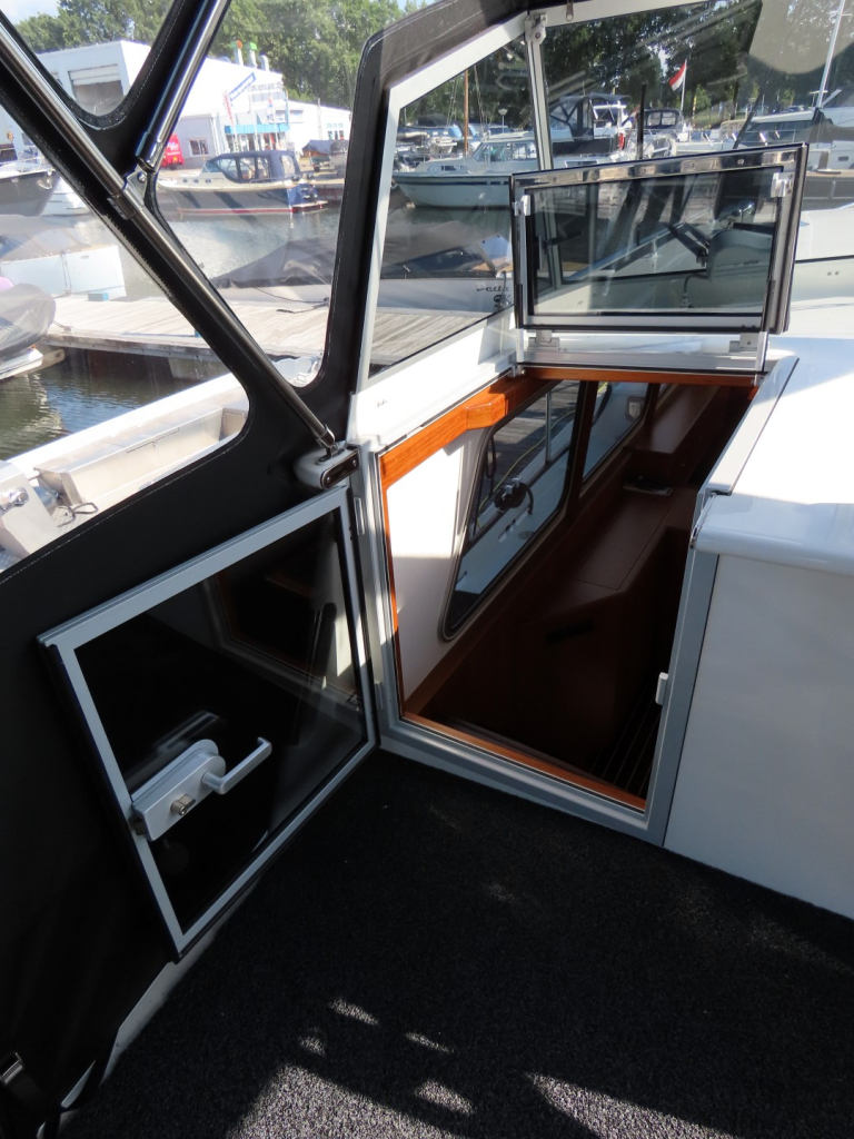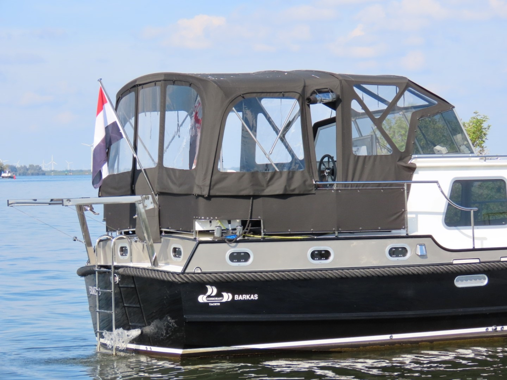 Zwarte kabelaring. RVS mast, elektrisch strijkbaar. Zonneschermen voor de ramen. Meerdelige kap (ook over het gehele achterdek) met RVS frame.