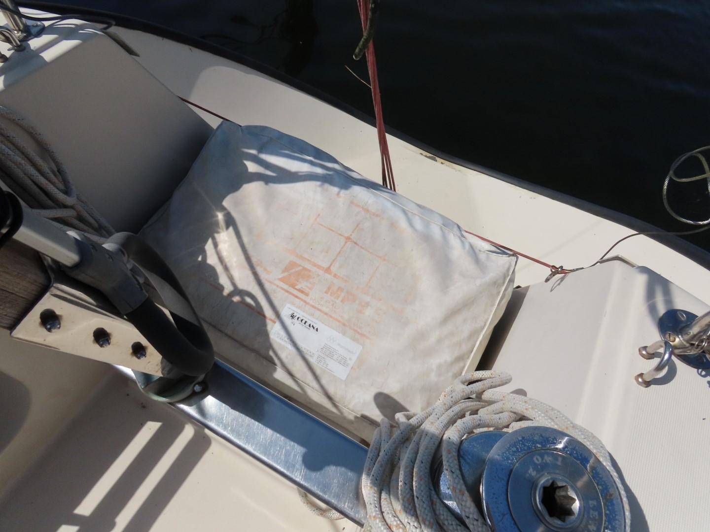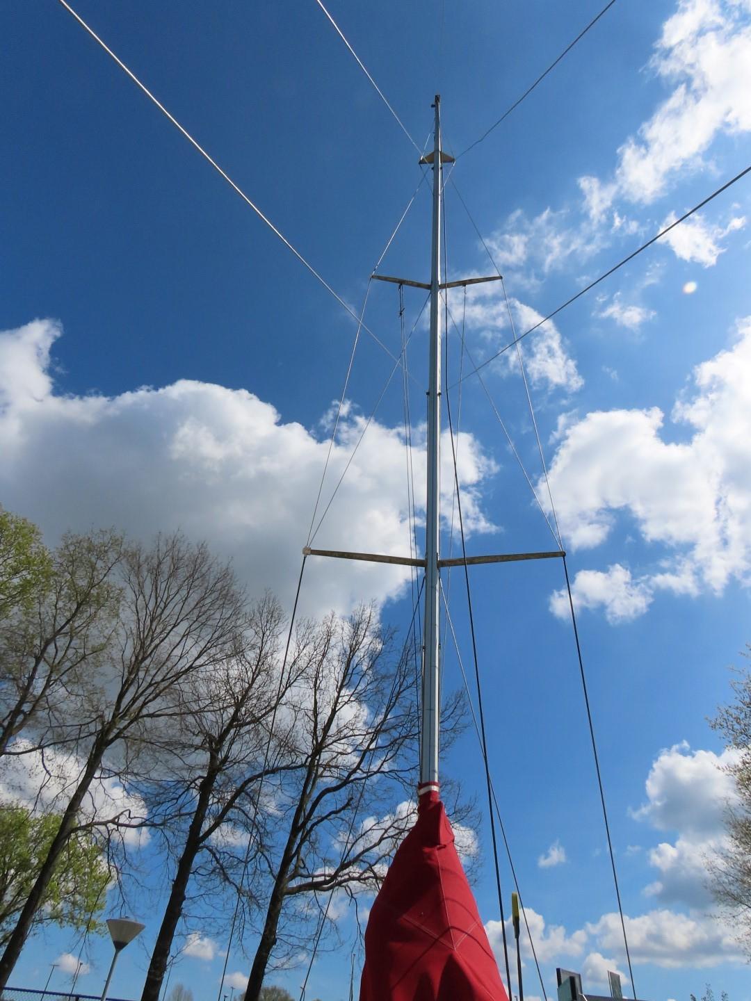 Grootzeil uit 2019. Genua en spinnaker. De mast is klapbaar, doorvaarthoogte dan slechts 12.50 meter.
