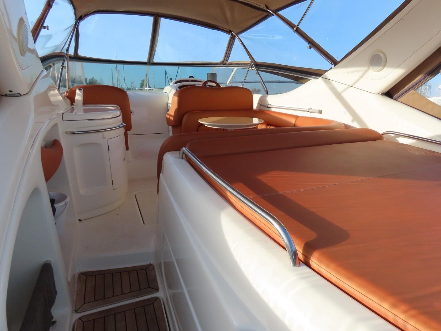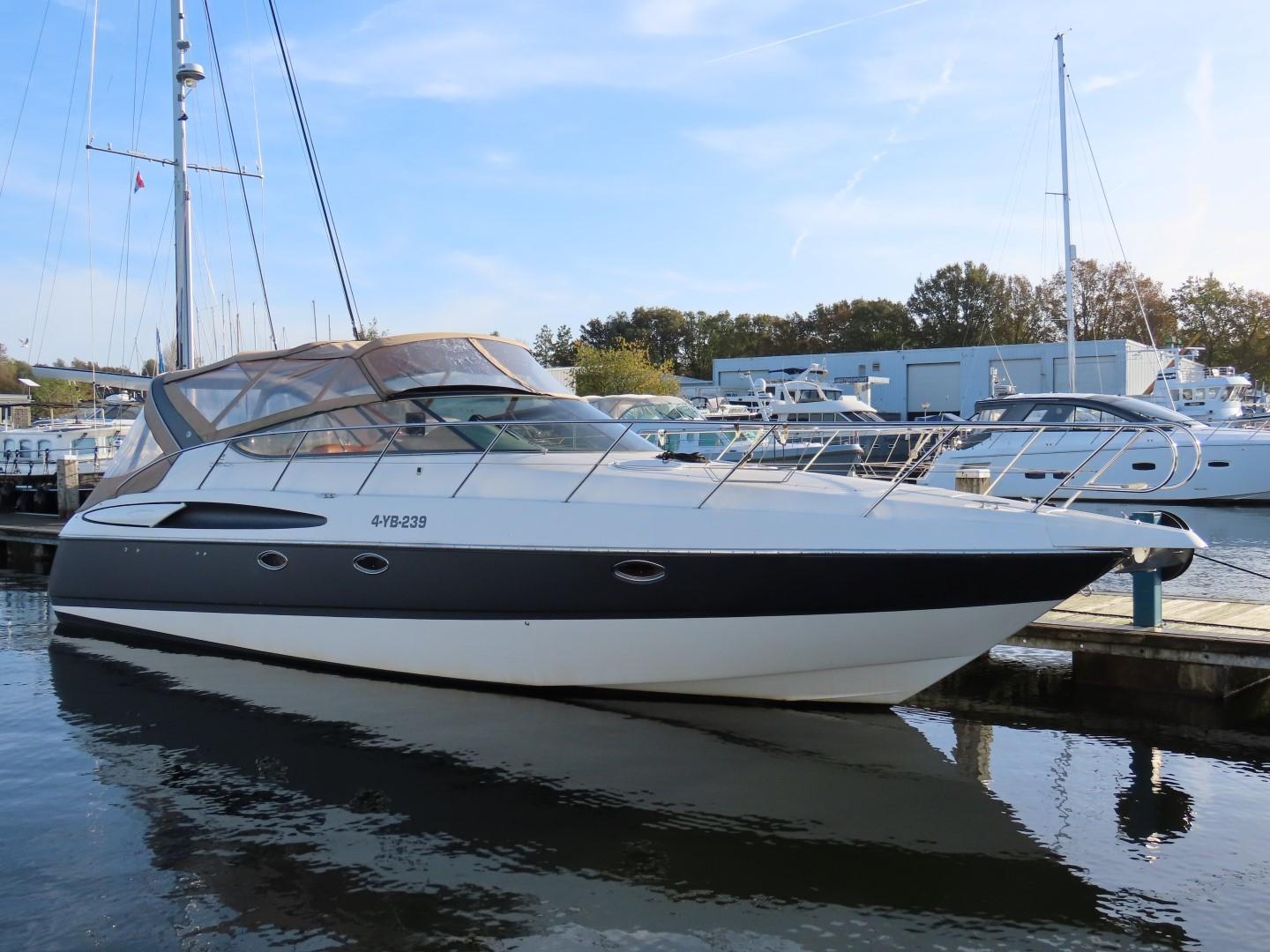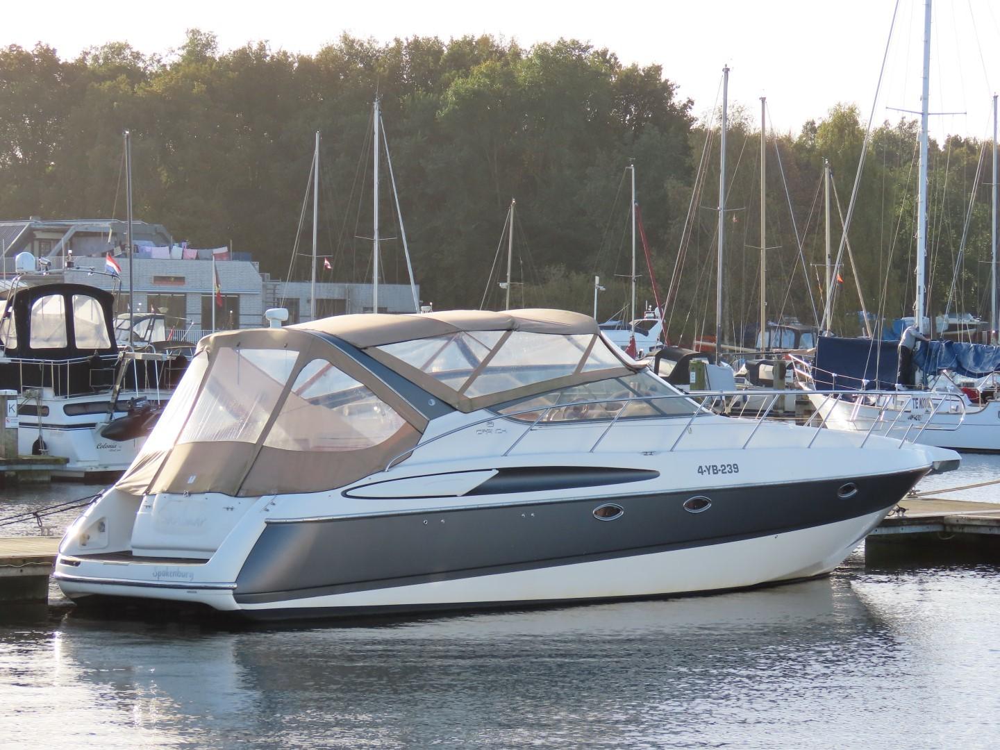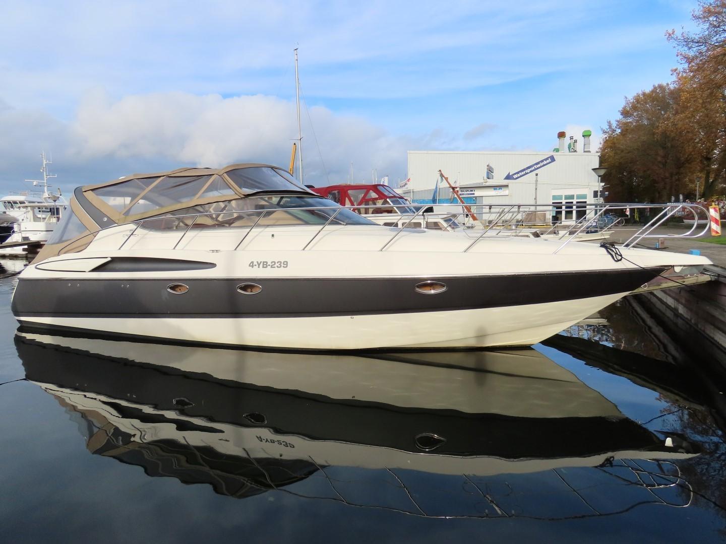 Snelle luxe sportcruiser met zeer royale kuip.  Italiaanse styling en goede vaareigenschappen. Boegschroef, omvormer en kap uit 2019. Elektrisch te openen garage voor bijbo