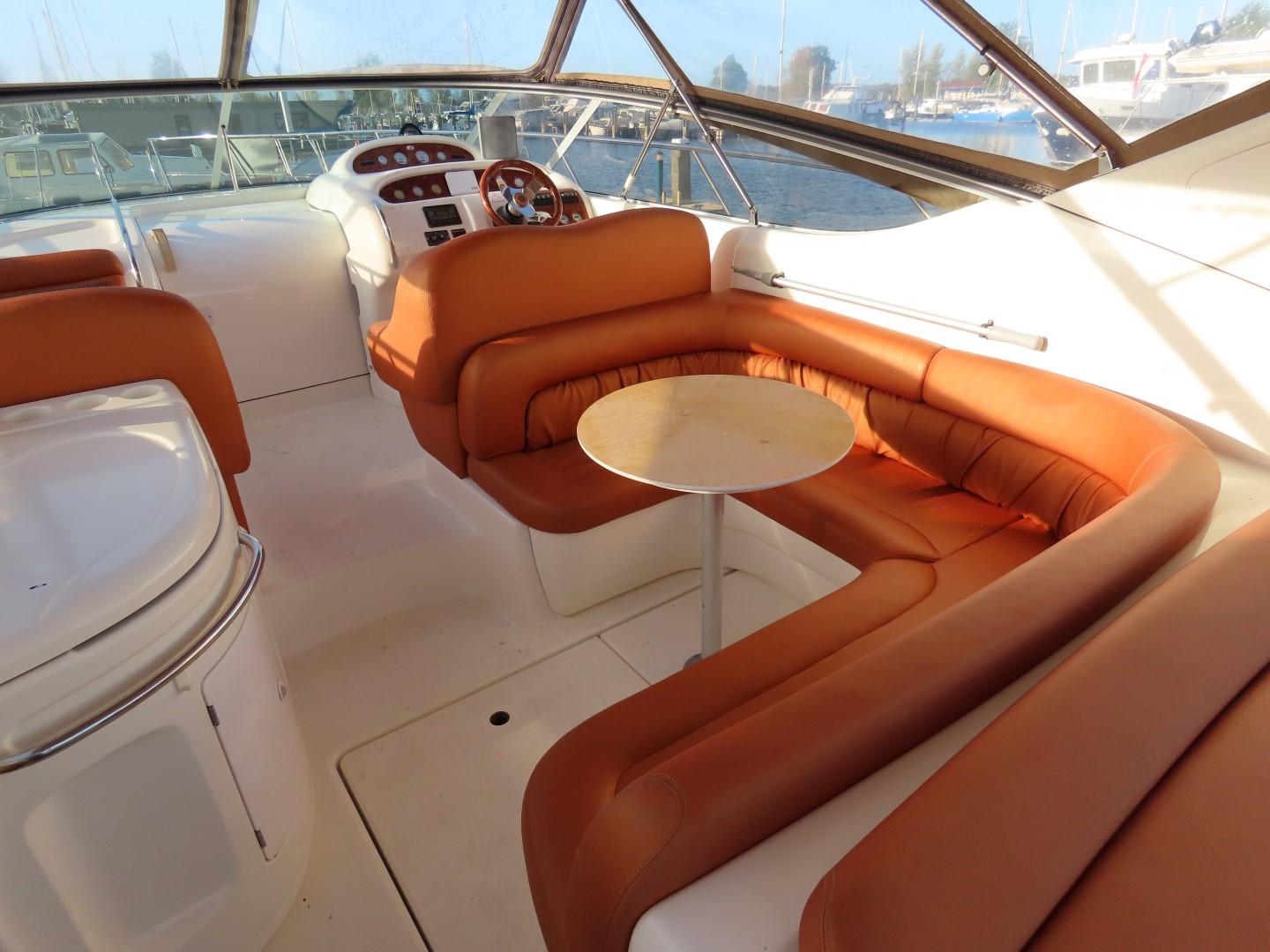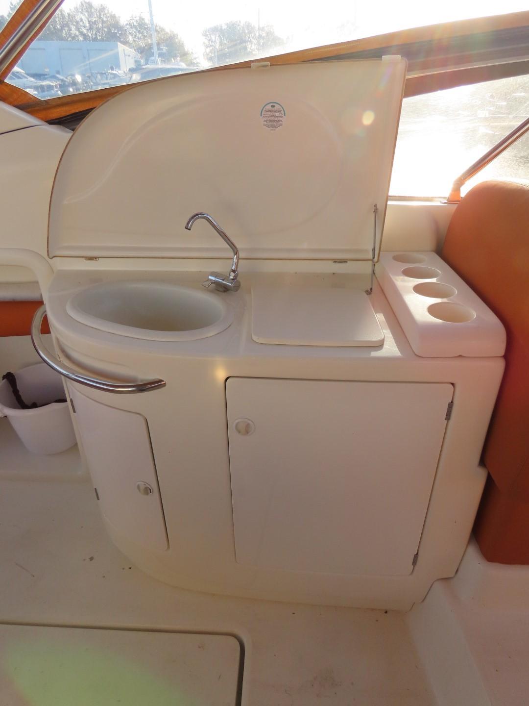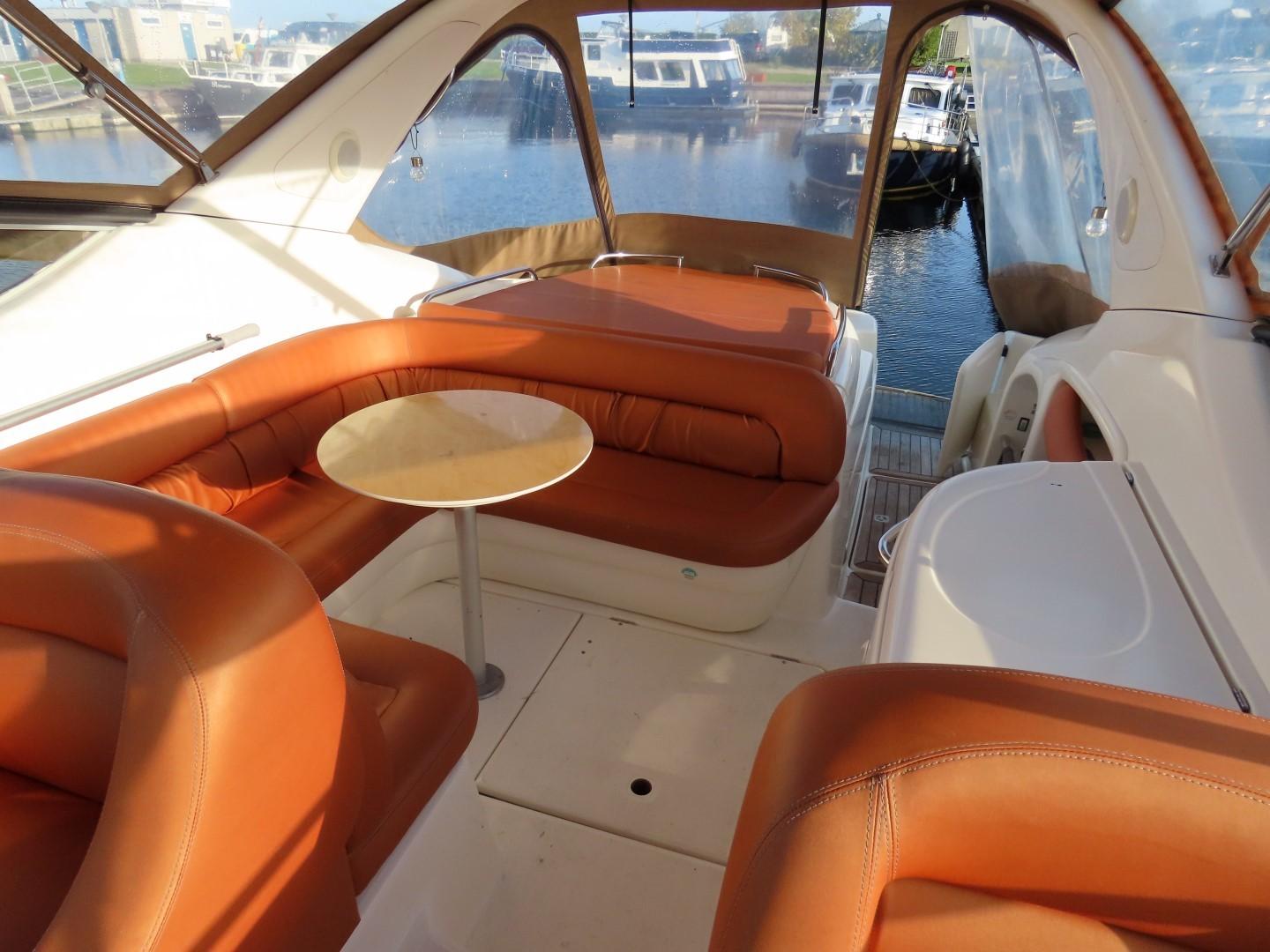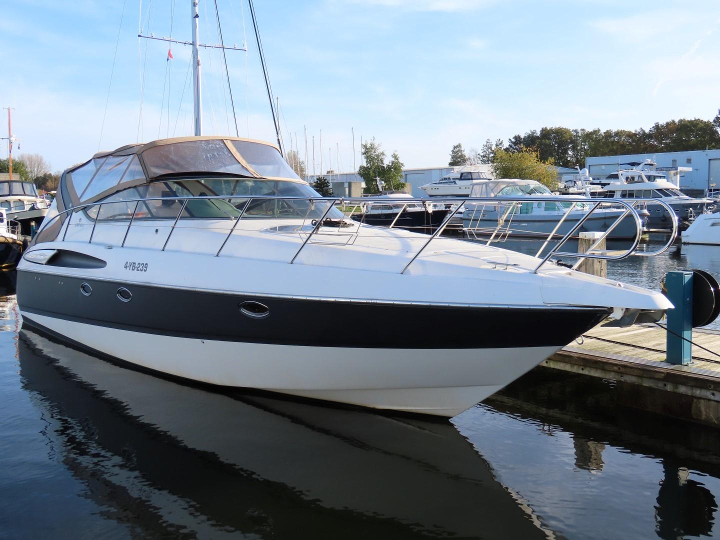 Snelle luxe sportcruiser met zeer royale kuip.  Italiaanse styling en goede vaareigenschappen. Boegschroef, omvormer en kap uit 2019. Elektrisch te openen garage voor bijbo