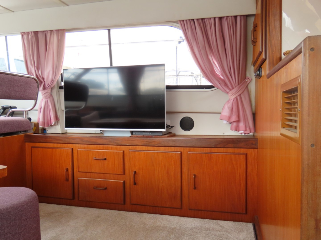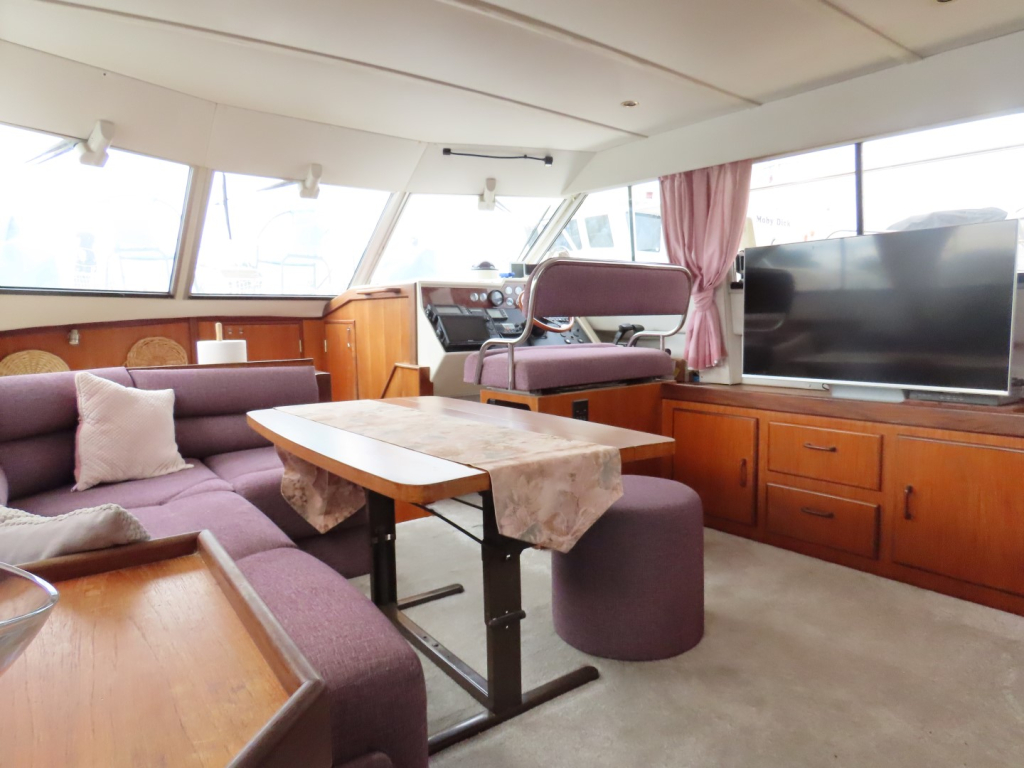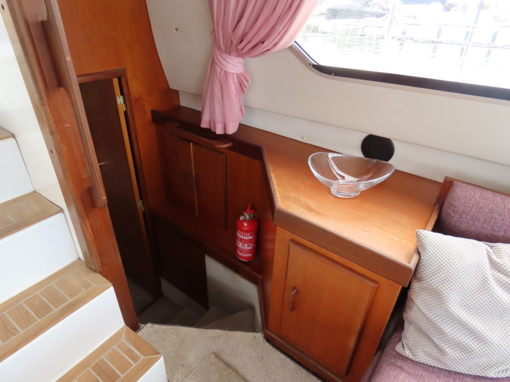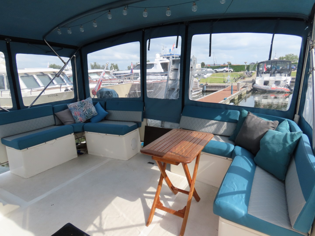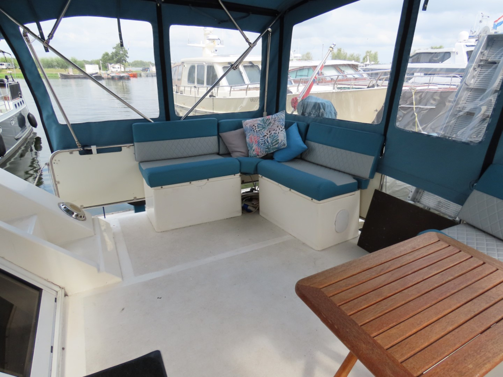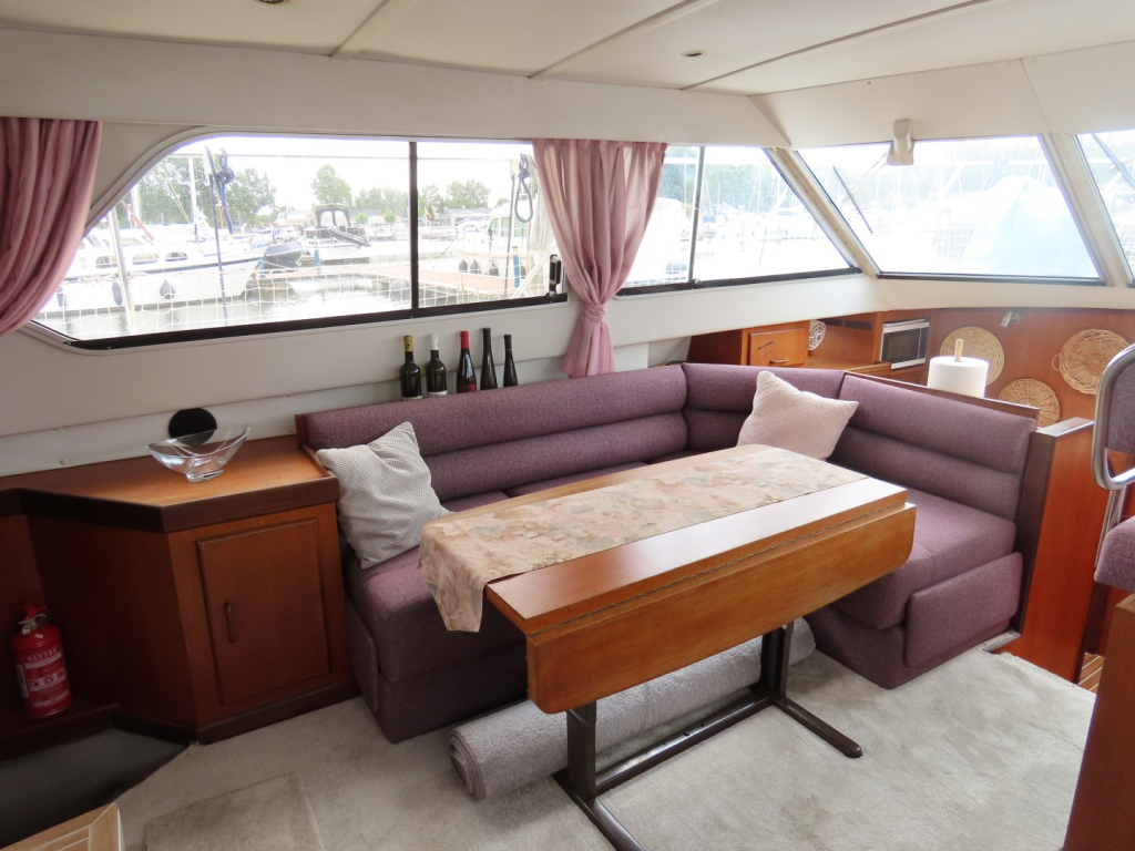 Voorpiek met dubbel bed. Toilet/ douche aan SB, hoekkombuis aan BB. Salon met stuurstand en kasten aan SB, bank aan BB. Achterkajuit met Frans bed en ensuite douche/ toilet. Veel kastruimte. Flatscreen in salon.