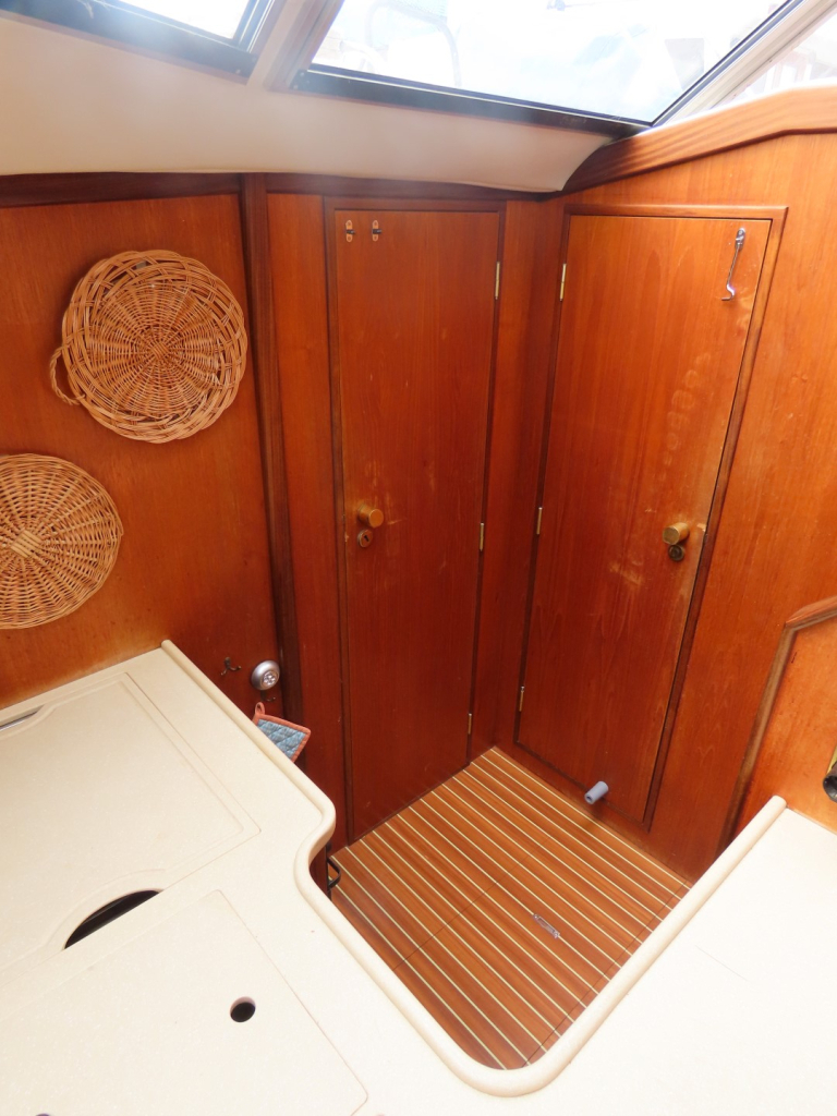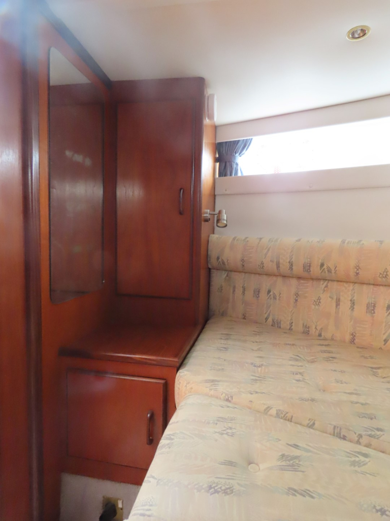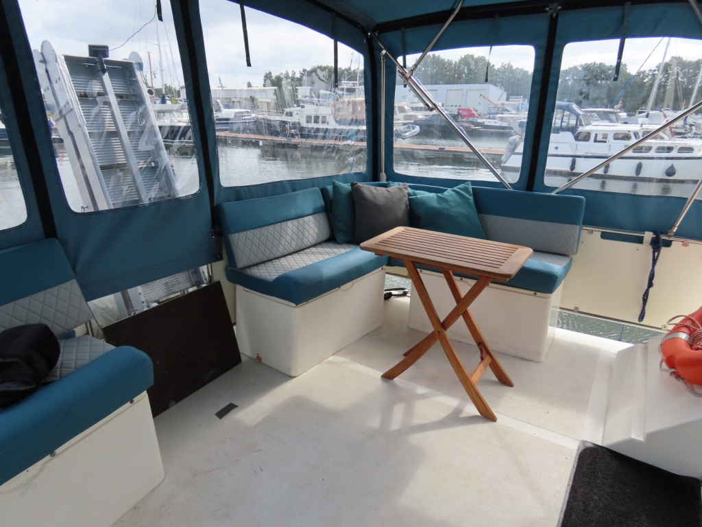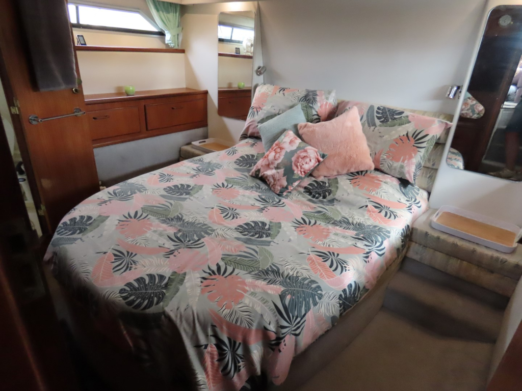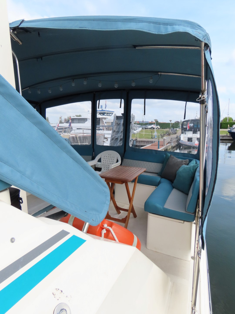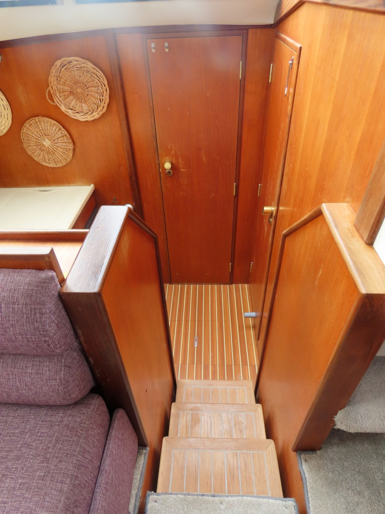 Voorpiek met dubbel bed. Toilet/ douche aan SB, hoekkombuis aan BB. Salon met stuurstand en kasten aan SB, bank aan BB. Achterkajuit met Frans bed en ensuite douche/ toilet. Veel kastruimte. Flatscreen in salon.