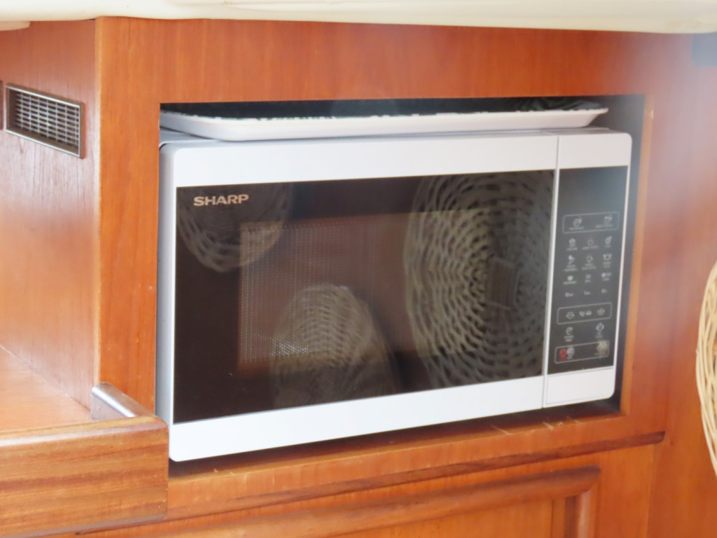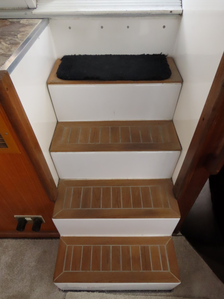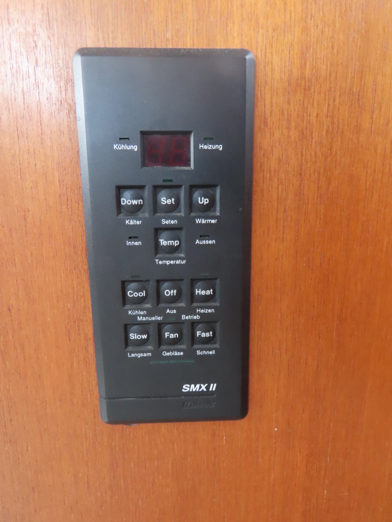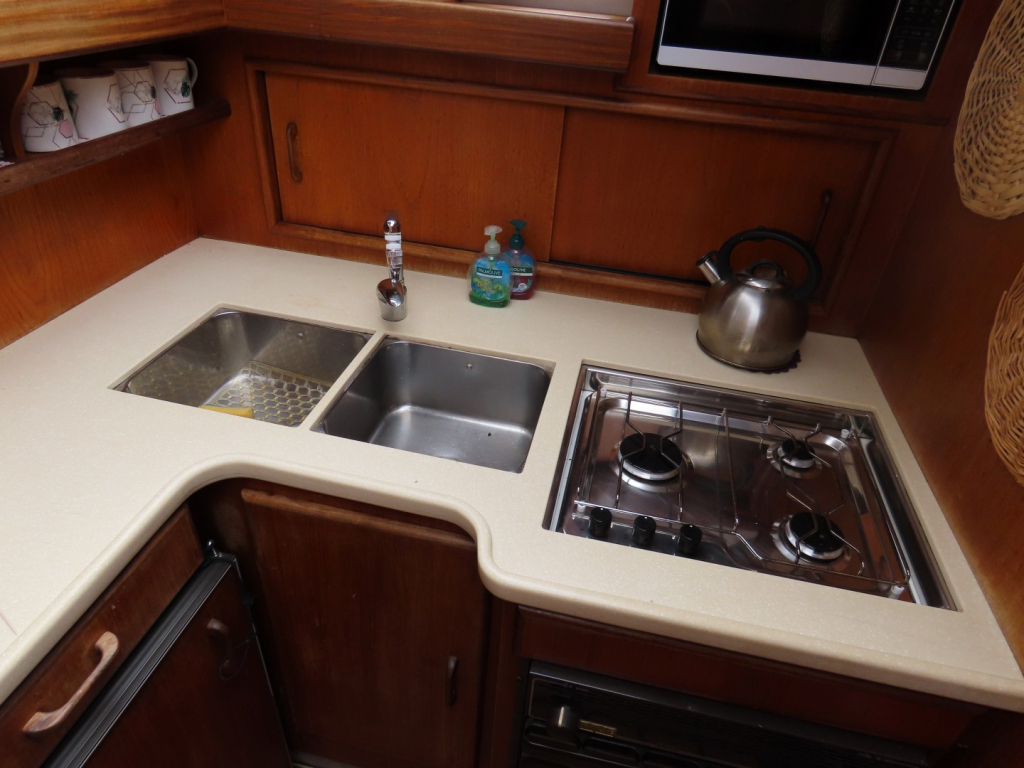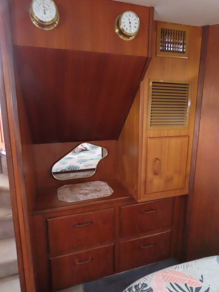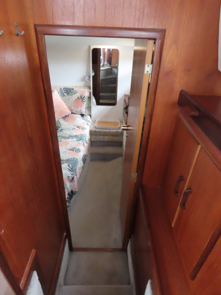 Voorpiek met dubbel bed. Toilet/ douche aan SB, hoekkombuis aan BB. Salon met stuurstand en kasten aan SB, bank aan BB. Achterkajuit met Frans bed en ensuite douche/ toilet. Veel kastruimte. Flatscreen in salon.