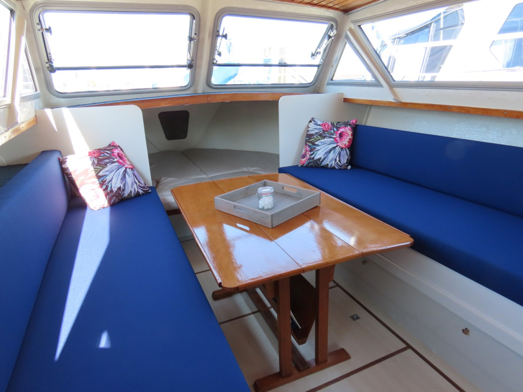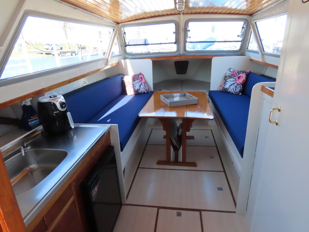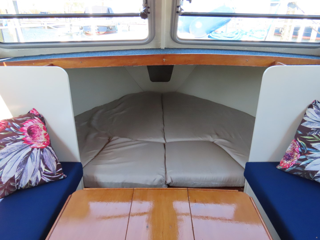 Voorpiek met V-bed. Banken (bedden) aan BB en SB. Kombuis aan BB, toilet aan SB. Kuip met stuurstand aan BB. Bank achterin.