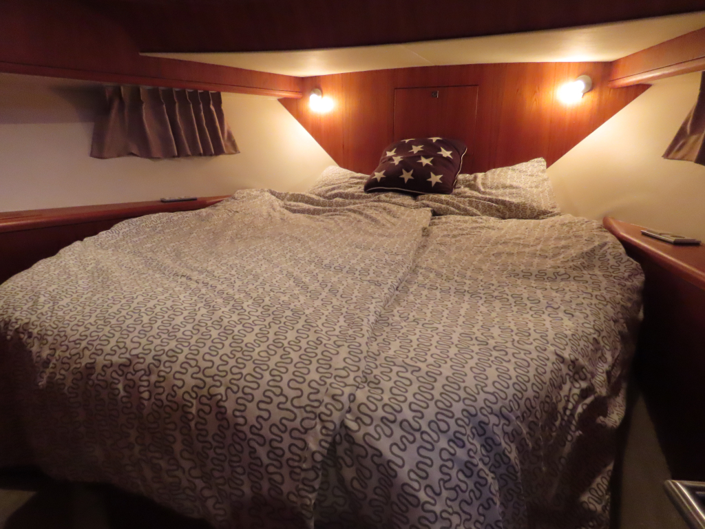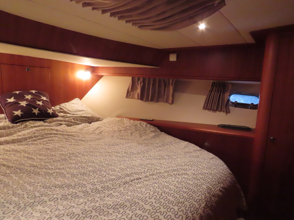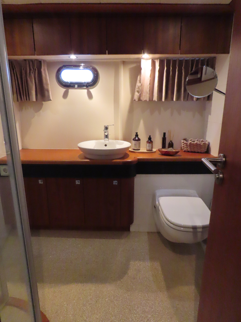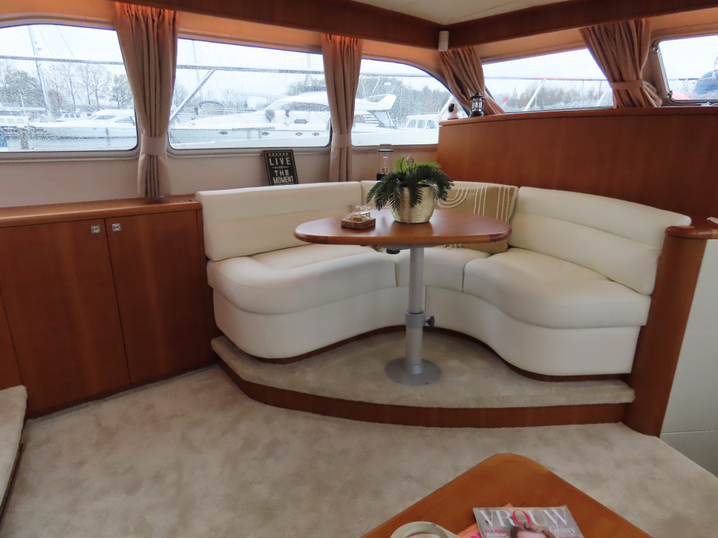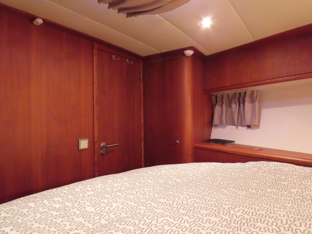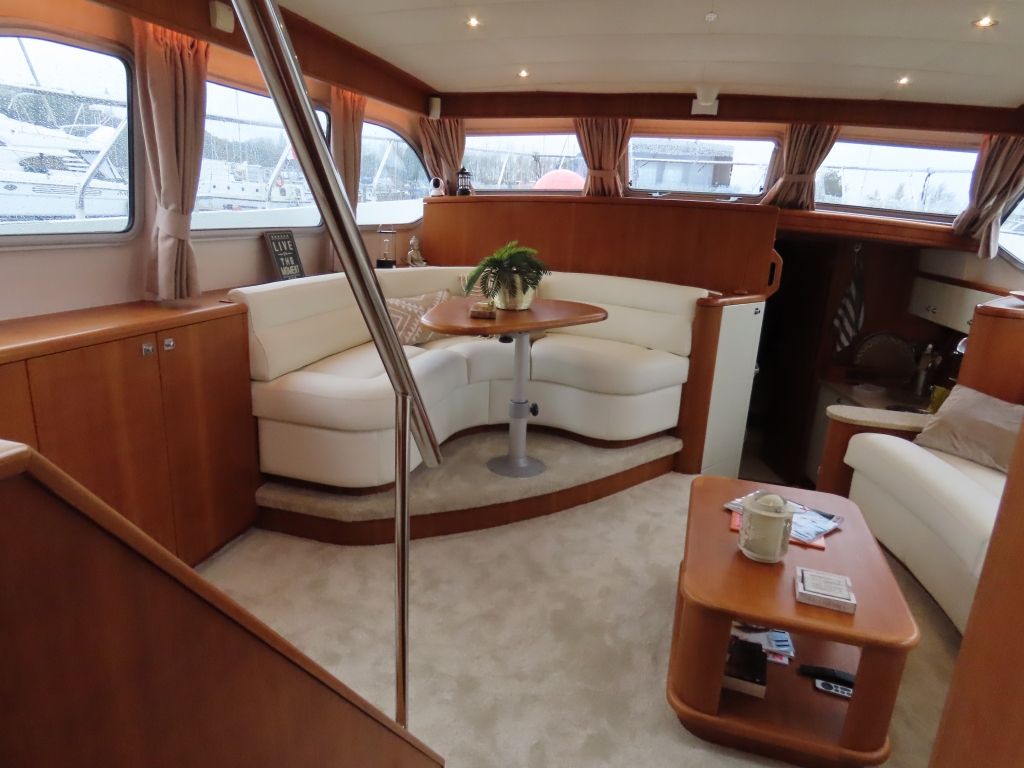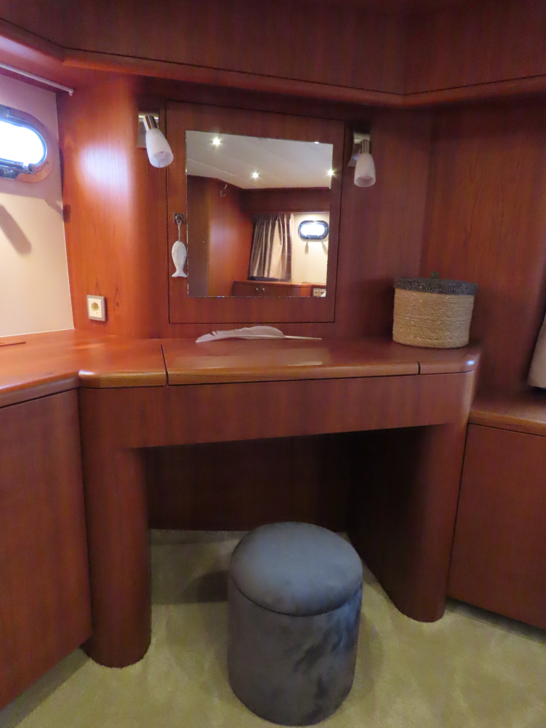 Bijzonder fraai teak interieur. 3 hutten met 6 vaste slaapplaatsen (2 x Frans bed) en 2 x douche/ toilet. Nieuwe lederen stoffering en vloerbedekking 2025. Vaatwasser, AEG wasmachine/ droger (2024), CV, airco in eigenaarshut.