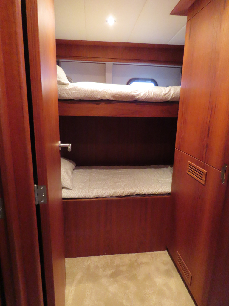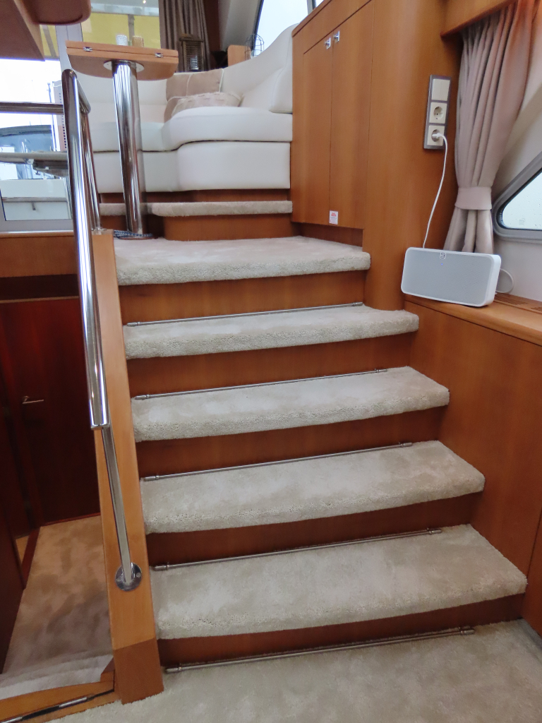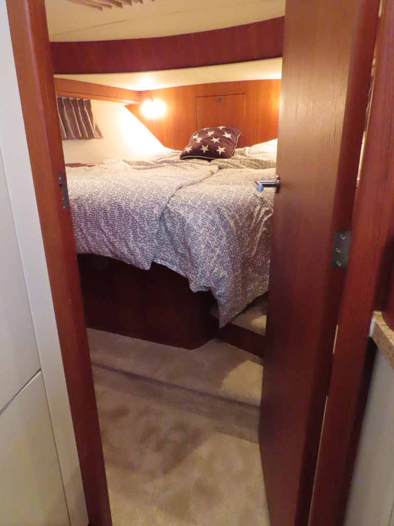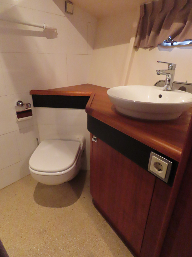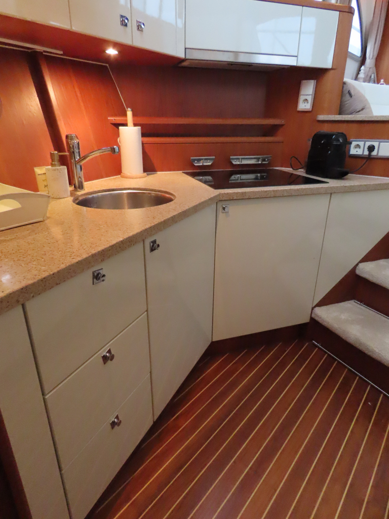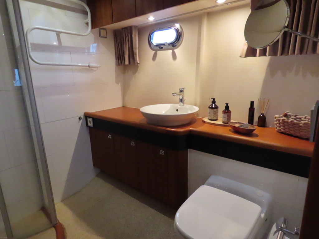 Bijzonder fraai teak interieur. 3 hutten met 6 vaste slaapplaatsen (2 x Frans bed) en 2 x douche/ toilet. Nieuwe lederen stoffering en vloerbedekking 2025. Vaatwasser, AEG wasmachine/ droger (2024), CV, airco in eigenaarshut.