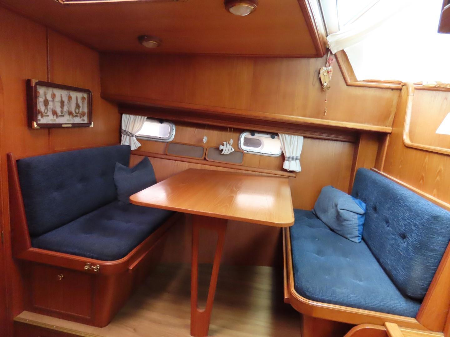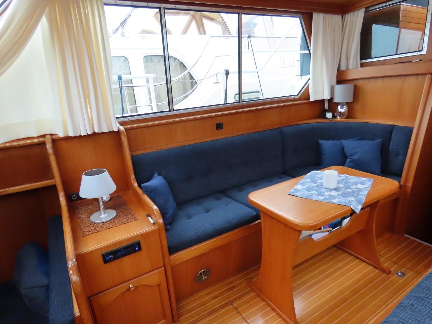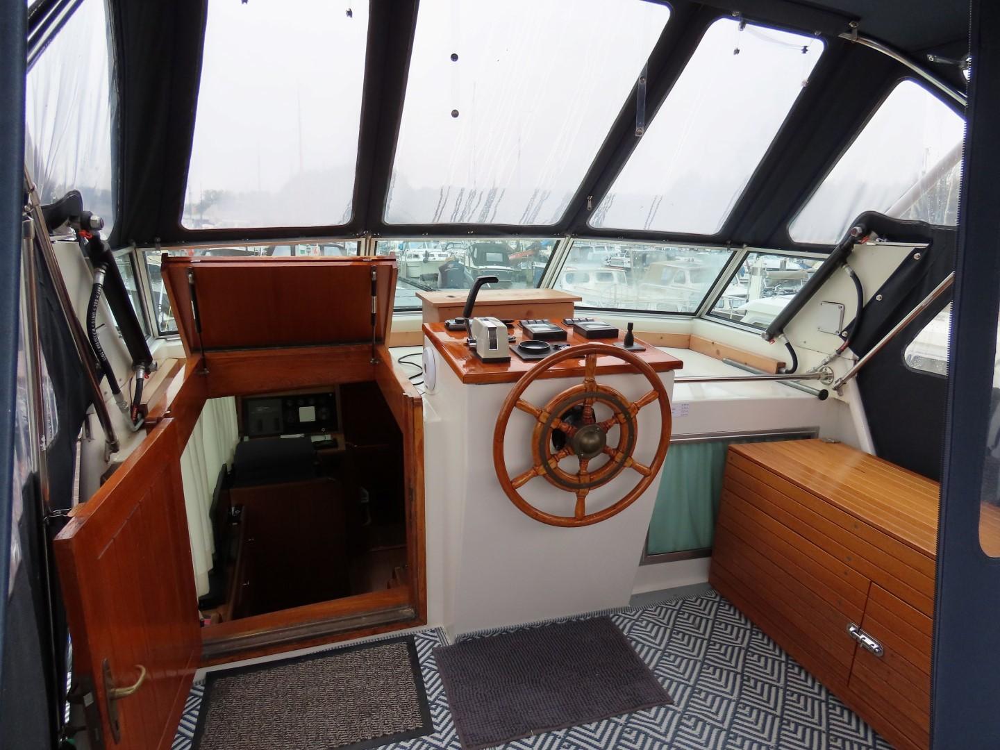Voorpiek met V-bed. Kajuit met dinette (dubbel bed) aan SB, hoekkombuis aan BB. Stuurhuis/ salon met stuurstand en kasten aan BB, bank aan SB. Ingang naar achterkajuit met aan BB douche/ toilet, tweepersoonsbed aan SB, kast aan BB. Achterdek met stuurstand