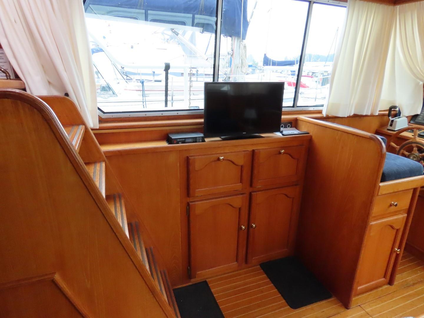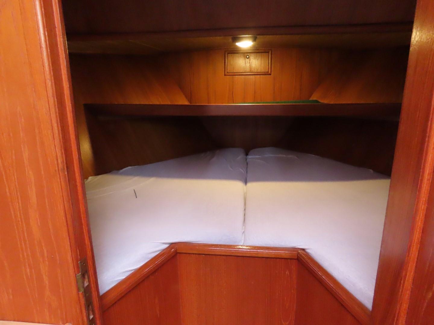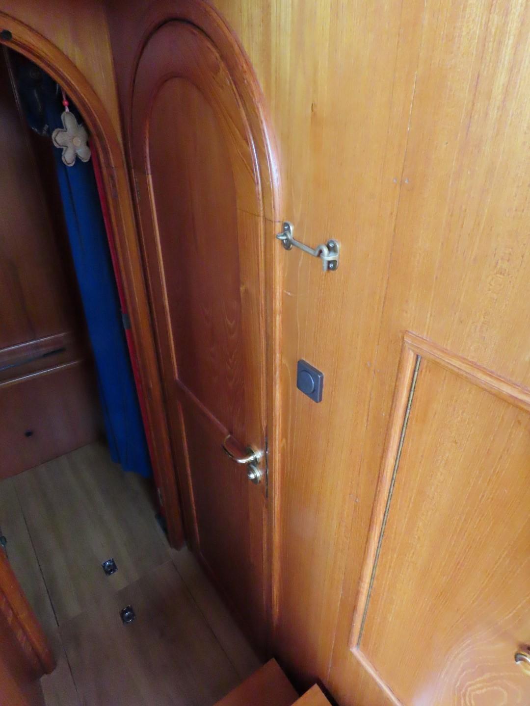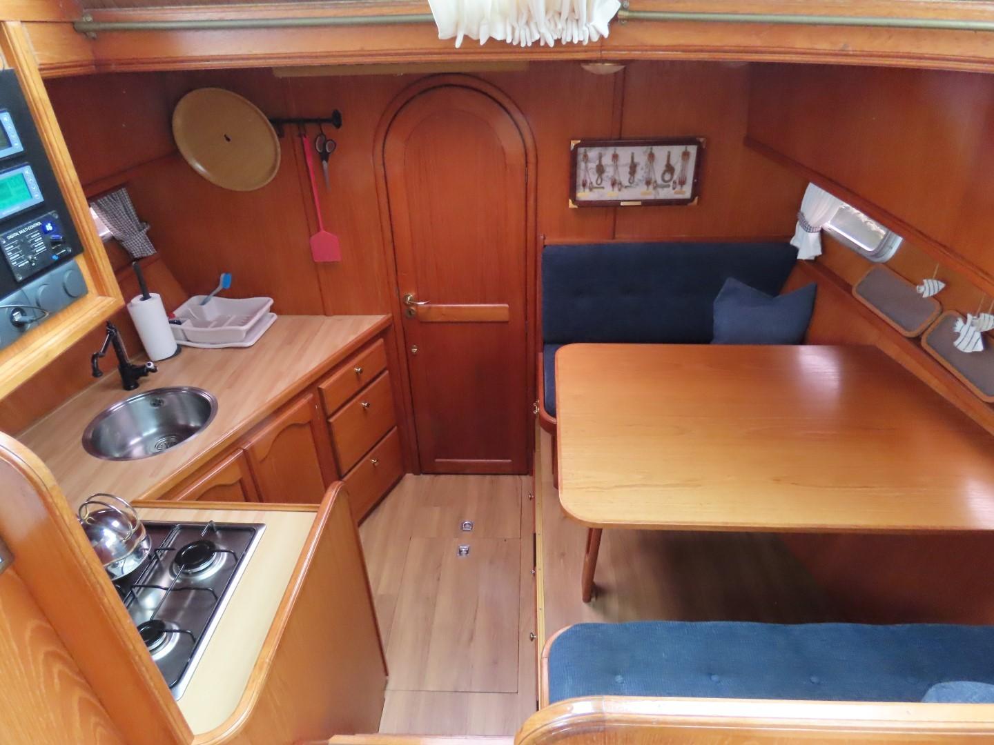 Voorpiek met V-bed. Kajuit met dinette (dubbel bed) aan SB, hoekkombuis aan BB. Stuurhuis/ salon met stuurstand en kasten aan BB, bank aan SB. Ingang naar achterkajuit met aan BB douche/ toilet, tweepersoonsbed aan SB, kast aan BB. Achterdek met stuurstand